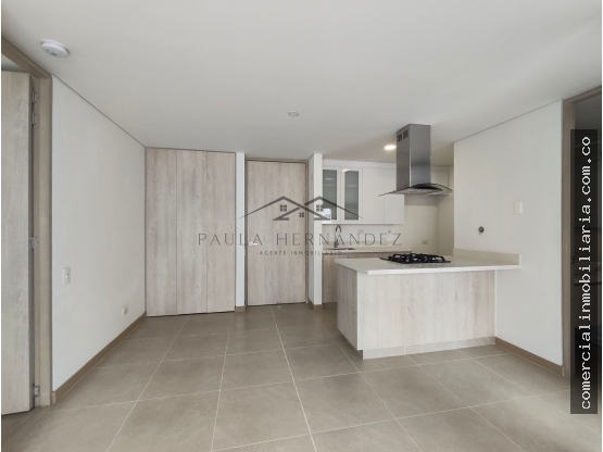 Apartamento sin poniente, vista norte, 74.8 m2 área construida, balcón amplio, 2 alcobas, principal con vestier, baño privado y acceso directo al Estudio, alcoba auxiliar con clóset y acceso al balcón, cocina abierta, zona de ropas independiente, clóset de linos, sala comedor, baño social completo, parqueadero doble lineal con infraestructura para carga eléctrica y cuarto útil.